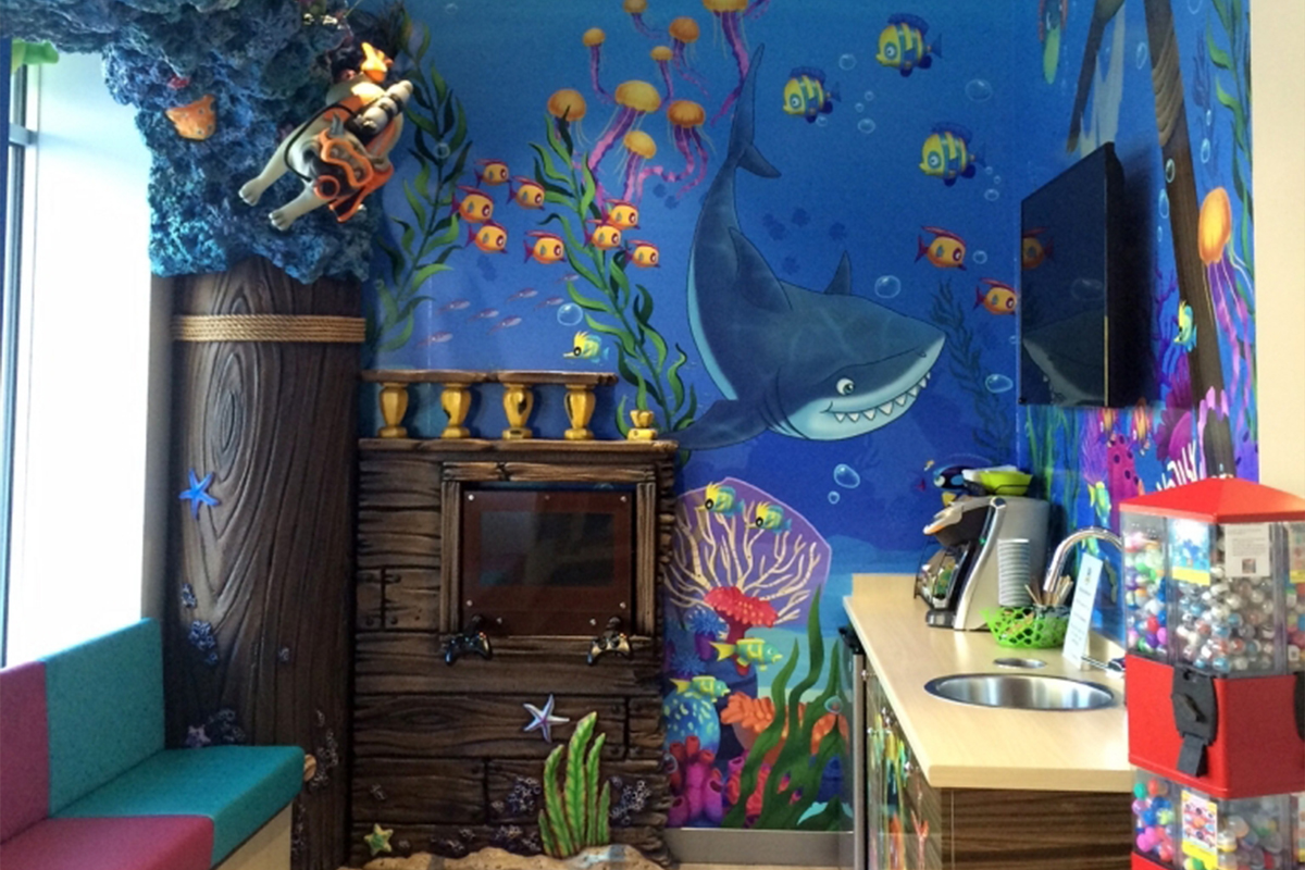 Colourful murals of sea creatures. a themed brushing station, kid-friendly music and more create a welcoming environment for children. Combined with our team's gentle and friendly demeanor, your children will feel right at home here.